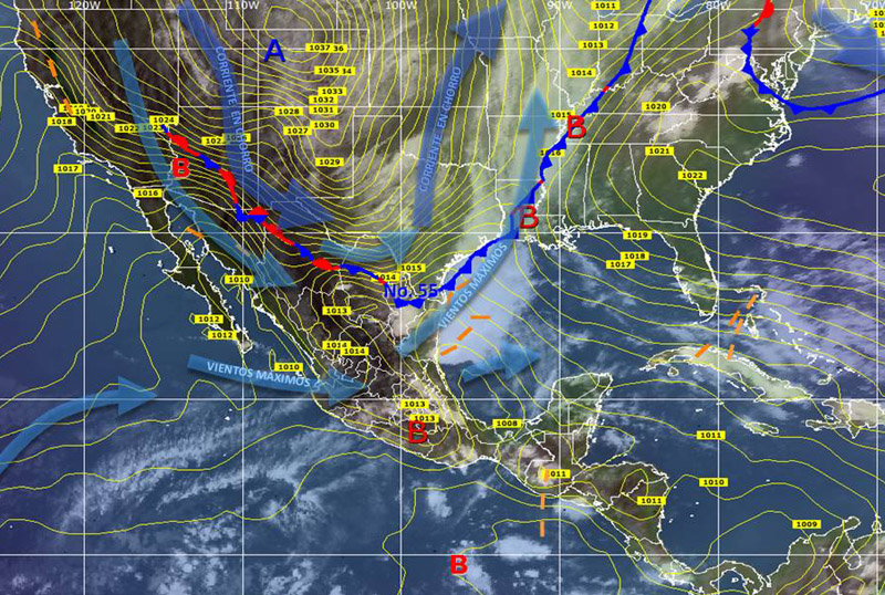 Su masa de aire frío ocasionará ligero descenso de las temperaturas en los estados del norte, noreste, oriente y centro de la República y un evento de “Norte” sobre el litoral del Golfo de México con rachas de viento de hasta 70 km/h que se extenderá durante la noche al Istmo y Golfo de Tehuantepec con vientos de hasta 90 km/h.