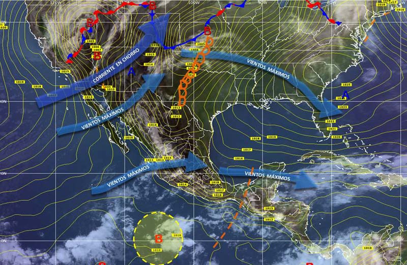 Circulación anticiclónica continuará dominando el Golfo de México propiciando un notable incremento en las temperaturas diurnas sobre gran parte del país; en su periferia provocará vientos de componente noreste de 30 a 50 km/h en la Península de Yucatán y la Sonda de Campeche, y de componente sur y sureste con las mismas intensidades sobre el litoral de Tamaulipas y los estados de Coahuila y Nuevo León. El aporte de aire cálido y húmedo de esta circulación hacia el interior del territorio nacional, favorecerá potencial de lluvias con actividad eléctrica en el oriente y noreste del país.