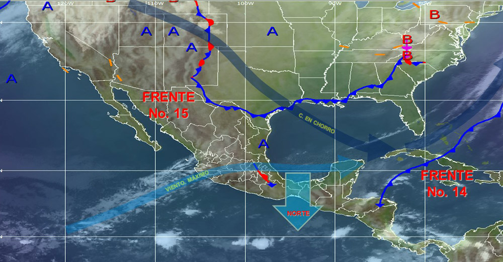 El frente frío número 15, sobre el norte de Coahuila y Nuevo León, se desplazará lentamente hacia el este-sureste; a su paso generará potencial de lluvia menores de 25 mm en Tamaulipas y oriente de San Luis Potosí, y además reforzará el descenso de temperatura en el norte y noreste de la nación, además de condiciones de “Norte” en el Golfo de México con vientos de hasta 60 km/h.