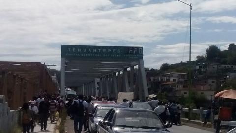 Tehuantepec, Oaxaca.- En medio de un diálogo que se realiza entre el presidente municipal Donovan Rito García con familiares de las personas que permanecen detenidas por los disturbios del pasado martes en esta ciudad, un grupo de colonos bloquean el Puente de Fierro para exigir su liberación.