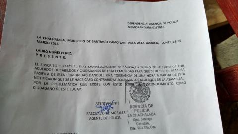 Oaxaca.- Este día, el pastor cristiano, Lauro Núñez Pérez, vecino de la comunidad de “Las Chachalacas” de Santiago Camotlán, fue notificado por la autoridad municipal que tendría que dejar dicha comuna una hora como máximo después de haber recibido la notificación, esto por la religión que profesa.