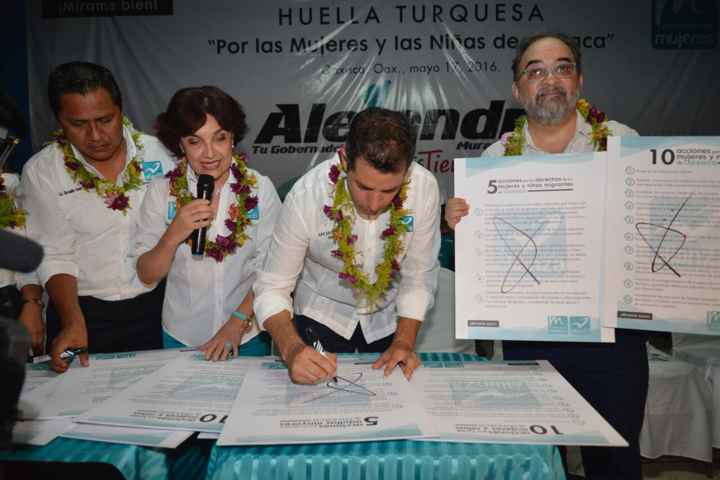 Oaxaca, Oax.- Alejandro Murat Hinojosa, candidato a la gubernatura por los partidos Revolucionario Institucional (PRI), Verde Ecologista de México (PVEM) y Nueva Alianza (Panal), signó su compromiso de ofrecer un gobierno de equidad para la infancia y las mujeres del estado en el encuentro con la militancia del Panal, denominado Huella Turquesa por las Mujeres y Niñas de Oaxaca.
