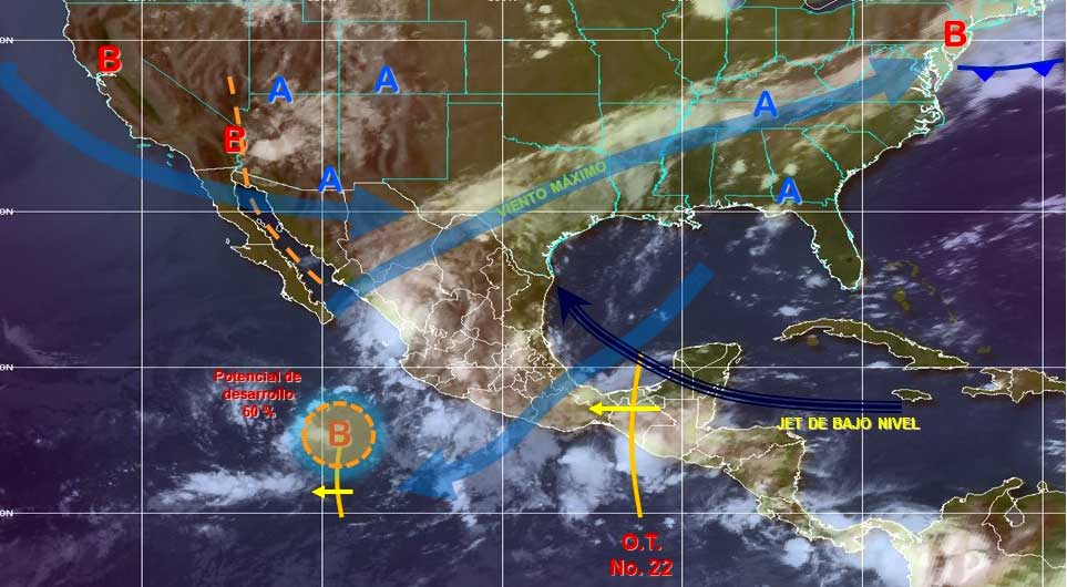 La onda tropical No. 22 se localizará sobre el sureste de México, generando potencial de tormentas muy fuertes Oaxaca y Veracruz; tormentas fuertes en Chiapas, Tabasco y Campeche; lluvias con intervalos de chubascos en Quintana Roo, y lluvias escasas o lloviznas en Yucatán.