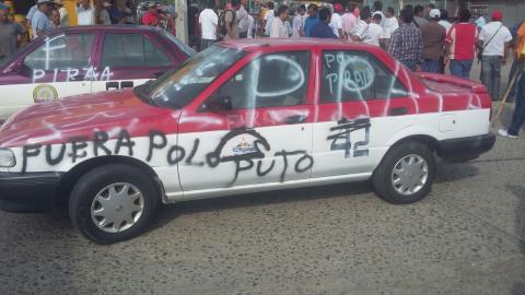 Salina Cruz, Oaxaca. Con palos y piedras un grupo de personas encabezados por Javier Córdova Quevedo, retuvieron y pintarrajearon dos taxis en la entrada a esta ciudad, donde mantiene un bloqueo.