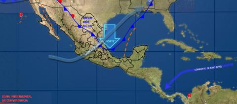 Por otro lado, un nuevo frente frío asociado con inestabilidad en altura, se aproximará al noroeste de México, ocasionará descenso de temperatura en dicha región, así como vientos con rachas superiores a 60 km/h en el Mar de Cortés, acompañadas de posibles tolvaneras en Baja California, Sonora, Durango y Chihuahua, además de potencial de lluvias con intervalos de chubascos y tormentas eléctricas en Baja California.