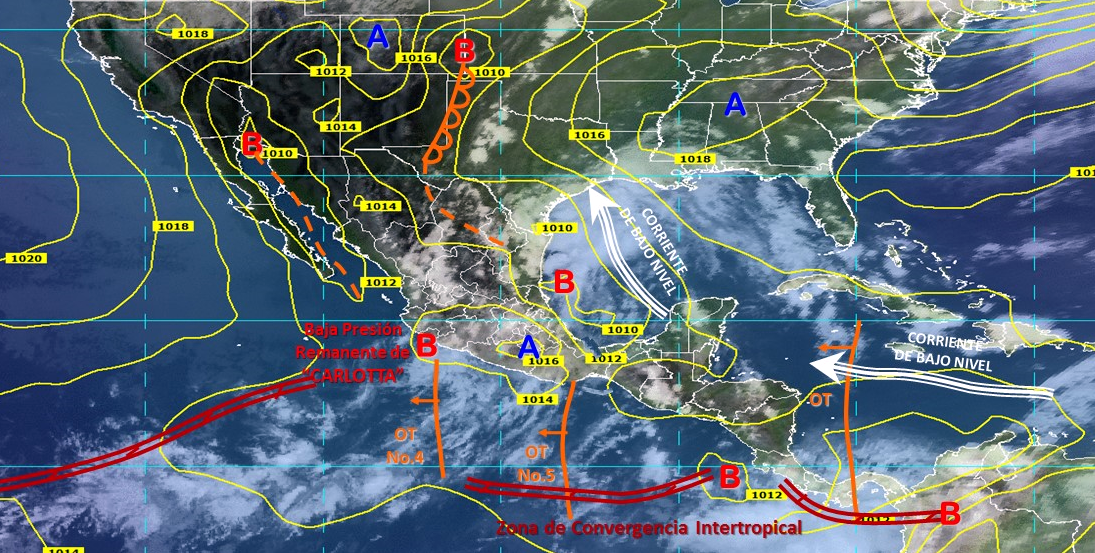 La onda tropical No. 4 recorrerá el occidente del territorio y un canal de baja presión se extenderá sobre el noroeste y occidente del país, ambos interactuarán con los remanentes de "Carlotta".