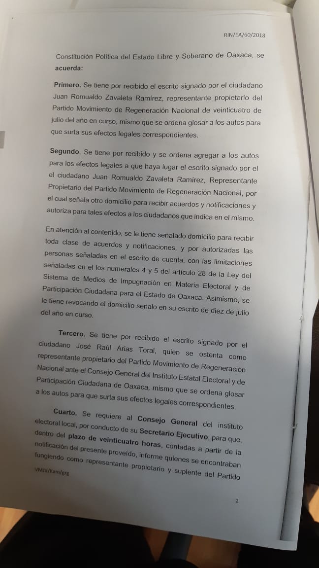 Sin embargo, el pasado 26 de julio a las 12:40 del día, mediante escrito signando por el actor Juan Romualdo Zavaleta Ramírez, representante del propietario del partido de MORENA ante el CME de San Pedro Mixtepec, se presentó el DESISTIMIENTO DE TODA ACCIÓN Y MEDIO DE IMPUGNACIÓN.