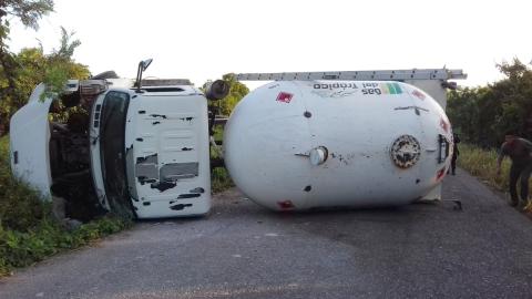 El exceso de velocidad provocó que la pipa volcara que quedara recostada, no se tienen indicios de fuga.