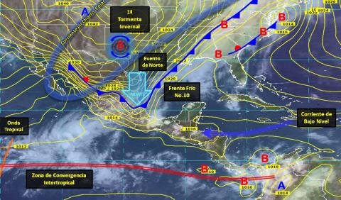 México.- La primera tormenta invernal se localizará en el sureste de Estados Unidos y su pulso secundario se ubicará sobre el noroeste de México, ambas se combinarán con el frente frío No. 10 y su intensa masa de aire polar continental, lo que favorecerá una onda gélida con marcado descenso de temperatura en la mayor parte del territorio, tormentas intensas a puntuales torrenciales en el sur del litoral del Golfo de México y el sureste del país, y tormentas muy fuertes a puntuales intensas en el sur del territorio y la Península de Yucatán, así como tormentas puntuales fuertes a muy fuertes, con posible caída de granizo en el centro y oriente de México.