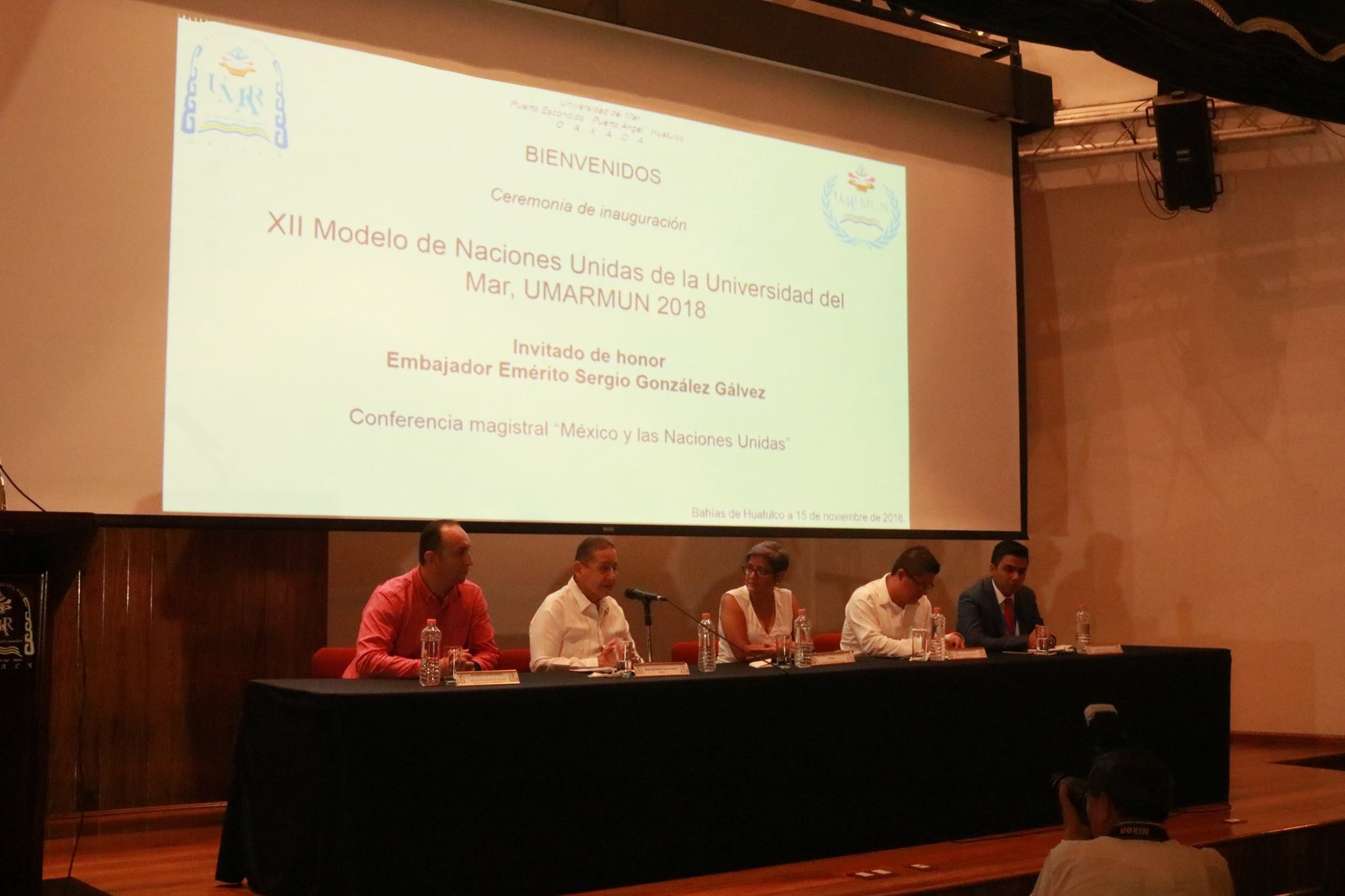 Oaxaca.- El pasado jueves 15 y viernes 16 de noviembre del presente año se realizó la XII edición del Modelo de Naciones Unidas de la Universidad del Mar, UMARMUN 2018 en campus Huatulco teniendo como invitado de honor al Embajador Emérito Sergio González Gálvez quien compartió con estudiantes de las carreras de Relaciones Internacionales, Economía y Ciencias Marítimas su experiencia de más de 41 años en el Servicio Exterior Mexicano.