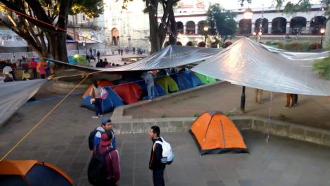 Oaxaca.- En su segundo día de paro de labores y plantón en el zócalo de la ciudad, maestros de la sección 22 de la CNTE de nivel secundaria analizan donde realizarán una protesta callejera más tarde, así lo confirmó Oliver León Barrios del área de conflictos de nivel secundaria.