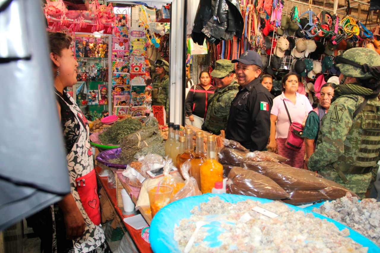 El titular de la Dirección, Capitán Aquileo Sánchez Castellanos, dijo que se trató de un Operativo “Presencia” en prácticamente todas las áreas del mercado, por lo que junto con el personal militar recorrieron los pasillos de este centro comercial, conforme lo ha ordenado el Presidente Municipal Oswaldo García Jarquín.
