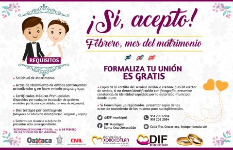 Santa Cruz Xoxocotlán, Oaxaca. El sistema para el Desarrollo Integral de la Familia de Santa Cruz Xoxocotlán extendió el periodo de recepción de documentos para las parejas interesadas en ser beneficiadas con el programa “¡Sí, acepto! Febrero, mes del matrimonio” que coordinan a través de la Dirección de Registro Civil del Gobierno del Estado de Oaxaca.