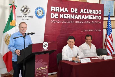 Oaxaca de Juárez, Oaxaca- “Debemos tender puentes y no muros; hoy iniciamos la construcción de uno, y estoy seguro que al paso del tiempo se volverá grande y fuerte”, afirmó el Presidente Municipal de Oaxaca de Juárez, Oswaldo García Jarquín, al firmar con James Darling, Alcalde de la ciudad de McAllen, Texas, el Acuerdo de Hermanamiento entre ambas metrópolis.