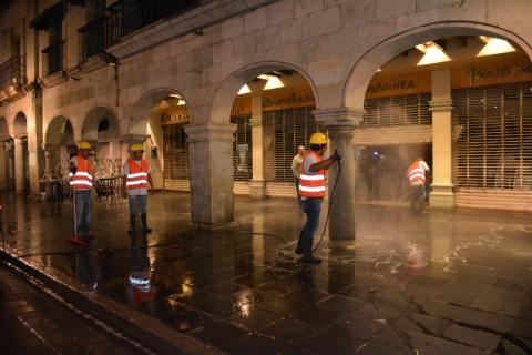 Durante la madrugada, personal del Ayuntamiento efectuó el lavado de banquetas, muros, luminarias y el desazolve de alcantarillas.