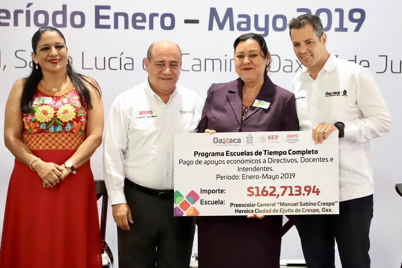 Santa Lucía del Camino, Oax. Para el fortalecimiento de la educación, el gobernador Alejandro Murat Hinojosa inició la entrega de apoyos económicos por un monto total de 364.8 millones de pesos correspondiente al Ejercicio Fiscal 2019 del Programa de Escuelas de Tiempo Completo (PETC). Con ello se beneficiará a 5 mil 349 directivos, docentes, intendentes y coordinadores de alimentación.