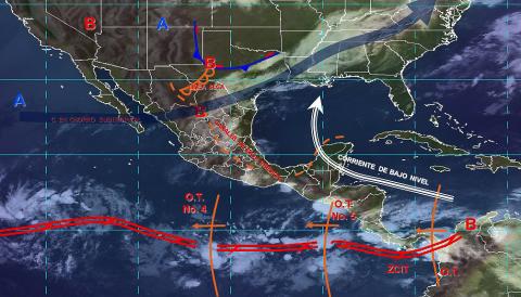 México. La onda tropical No. 4 se localizará al sur de las costas de Guerrero, la onda tropical No. 5 se ubicará al sur de Quintana Roo, mientras que un canal de baja presión se extenderá sobre el interior del país y un segundo lo hará sobre el sureste de México, por otra parte, una línea seca se extenderá sobre Coahuila, aunado al ingreso de humedad proveniente de ambos océanos, se pronostican lluvias vespertinas acompañadas de actividad eléctrica y posibles granizadas en gran parte de la República Mexicana.