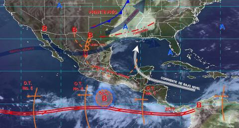 México. Un canal de baja presión se extenderá sobre el interior del país, mientras que una línea seca lo hará sobre el norte de México, interaccionarán con la entrada de aire cálido y húmedo del Golfo de México, ocasionarán rachas de viento superiores a 50 km/h sobre entidades del norte y noreste del país, así como lluvias fuertes a puntuales muy fuertes acompañadas de descargas eléctricas sobre el centro, occidente y oriente del territorio, por otra parte, la onda tropical No. 6 y una zona de inestabilidad con probabilidad de desarrollo ciclónico se localizarán al sur de las costas de Guerrero, mientras que la onda tropical No. 7, recorrerá el sureste de México, dichos sistemas meteorológicos generarán el siguiente potencial de lluvias, las cuales se acompañarán de descargas eléctricas y posibles granizadas.