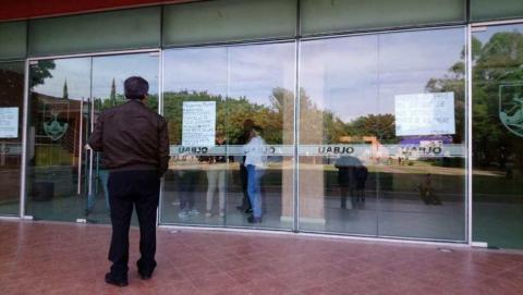 Oaxaca, Oax.- Integrantes del Sindicato de Trabajadores y Empleados de la Universidad Autónoma Benito Juárez de Oaxaca ( STEUABJO), tomaron este martes el edificio de rectoría, en la Universidad autónoma Benito Juárez de Oaxaca.