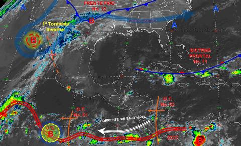 México. El intenso frente frío No. 12 y su masa de aire polar asociada ingresará sobre los estados del norte y noreste de México, mientras que la primera tormenta invernal de la temporada se ubicará sobre el noroeste del país. Por otra parte, la onda tropical No. 51 se desplazará sobre el occidente del territorio nacional y se prevé el ingreso de la onda tropical No. 52 a la Península de Yucatán, estos sistemas meteorológicos ocasionaran el siguiente potencial de lluvias.