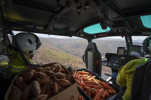 Desde el cielo, por medio de helicópteros, australianos lanzaron este fin de semana miles de kilogramos de alimentos a animales que han sido víctimas de los incendios forestales que han azotado al país.