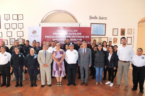 Oaxaca de Juárez, Oax.- Con la premisa de contar con elementos policíacos capacitados, en constante modernización, así como dotarlos de herramientas y argumentos sólidos para atender cualquier eventualidad que aqueje a la ciudadanía, el Ayuntamiento de Oaxaca de Juárez, a través de la Regiduría de Agencias y Colonias y de Municipio Seguro y Movilidad en coordinación con la Dirección de Seguridad Pública, Vialidad Y Protección Ciudadana, inició el curso-taller “Primeros Auxilios Sicológicos a Víctimas de Violencia Familiar” dirigido a elementos de la Policía Municipal.