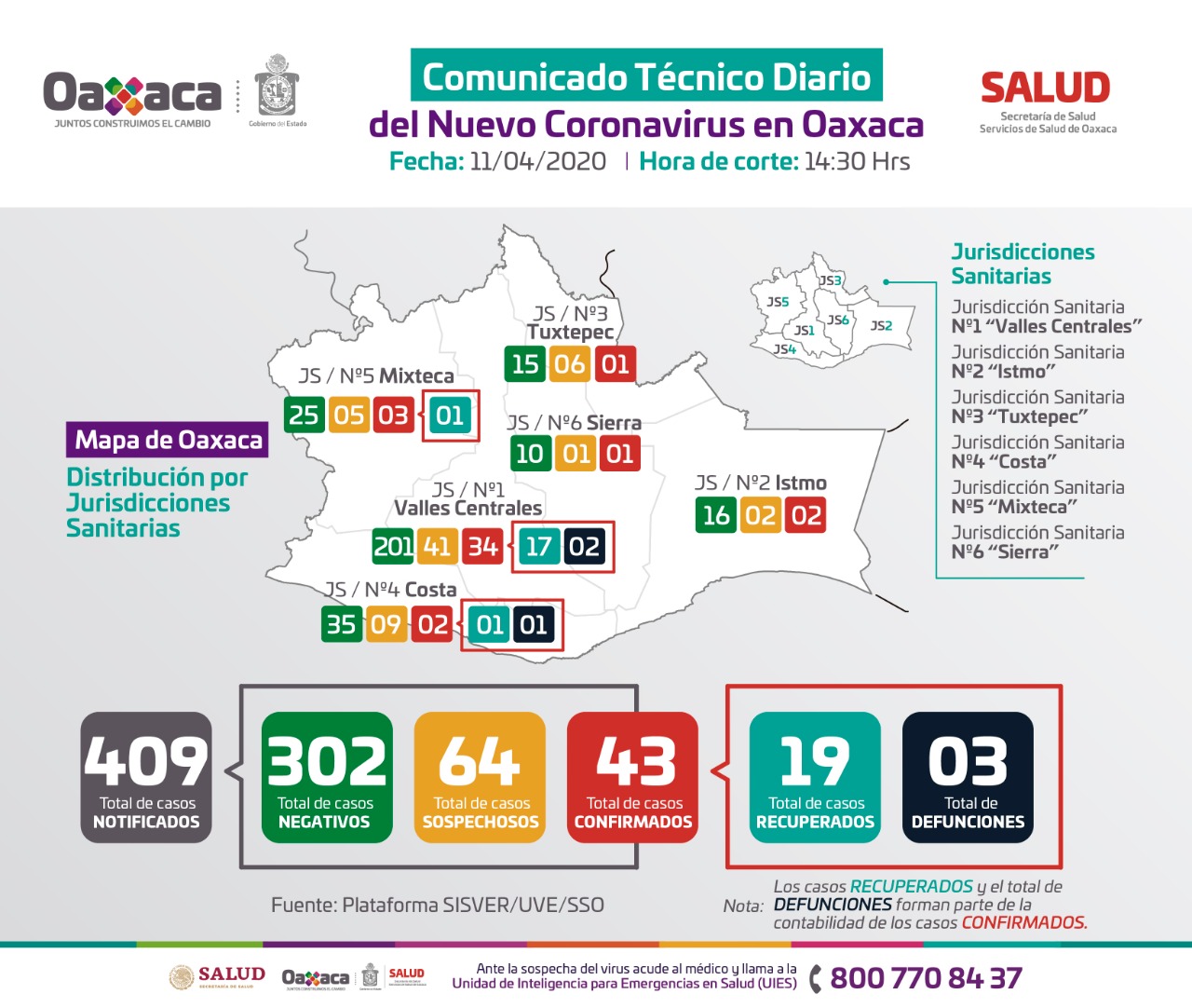 Oaxaca de Juárez, Oax. El secretario de Salud del Estado, Donato Casas Escamilla dio a conocer que al corte de este sábado 11 de abril, de acuerdo al Sistema Federal de Vigilancia Epidemiológica, en la entidad se han contabilizado 43 casos positivos a COVID-19.