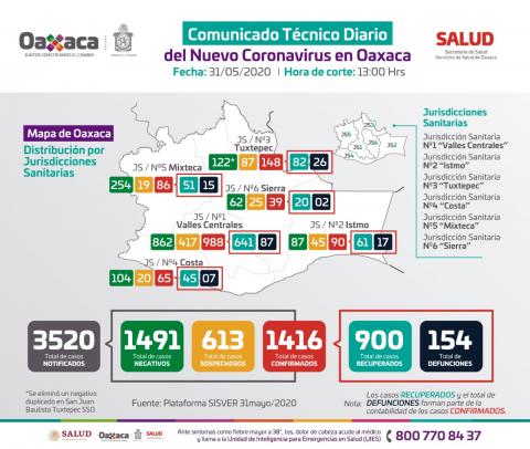 Expresó que de acuerdo con la actualización diaria del curso de la emergencia sanitaria en el estado, hasta este domingo 31 de mayo, se han detectado mil 416 casos positivos y 154 lamentables decesos.