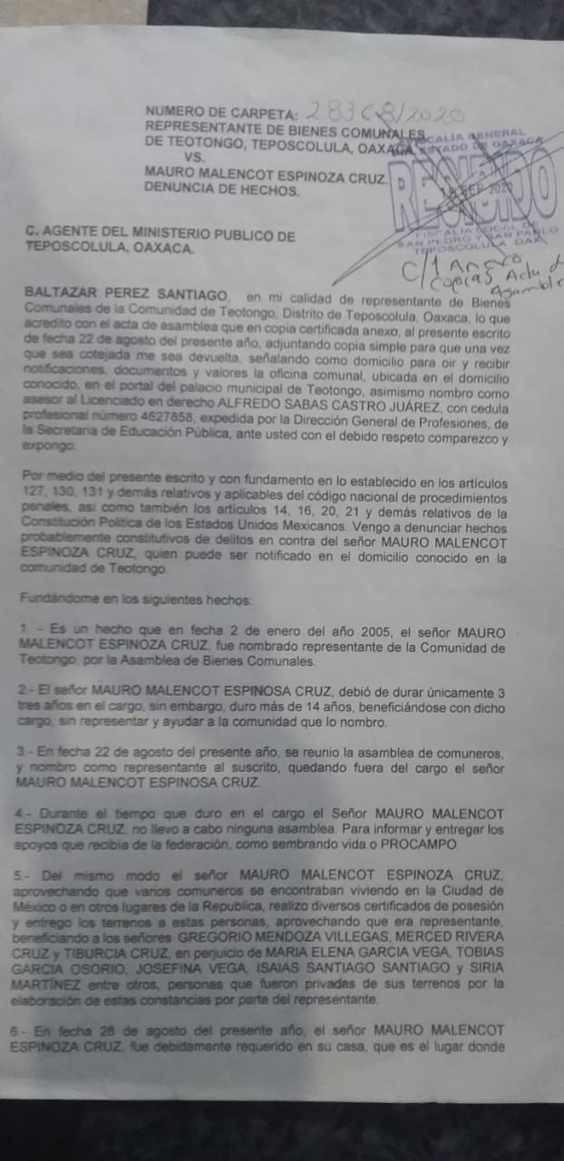 Oaxaca. Comuneros de la comunidad de Teotongo distrito de Teposcolula, se organizaron para quitar del cargo de Comisariado de Bienes Comunales a Mauro Malecont Espinoza Cruz, esto luego de pretender perpetuarse en el cargo.