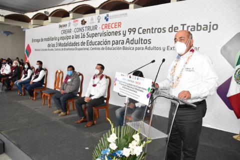 Ejutla de Crespo, Oaxaca. Para mejorar las condiciones y la labor en 16 Supervisiones y 99 Centros de Trabajo que atienden a cerca de 12 mil personas adultas de comunidades rurales y semiurbanas con educación y capacitación, con la representación del gobernador Alejandro Murat Hinojosa, el director general del Instituto Estatal de Educación Pública de Oaxaca (IEEPO), Francisco Ángel Villarreal, hizo entrega de mobiliario y equipo por un monto de cinco millones de pesos.