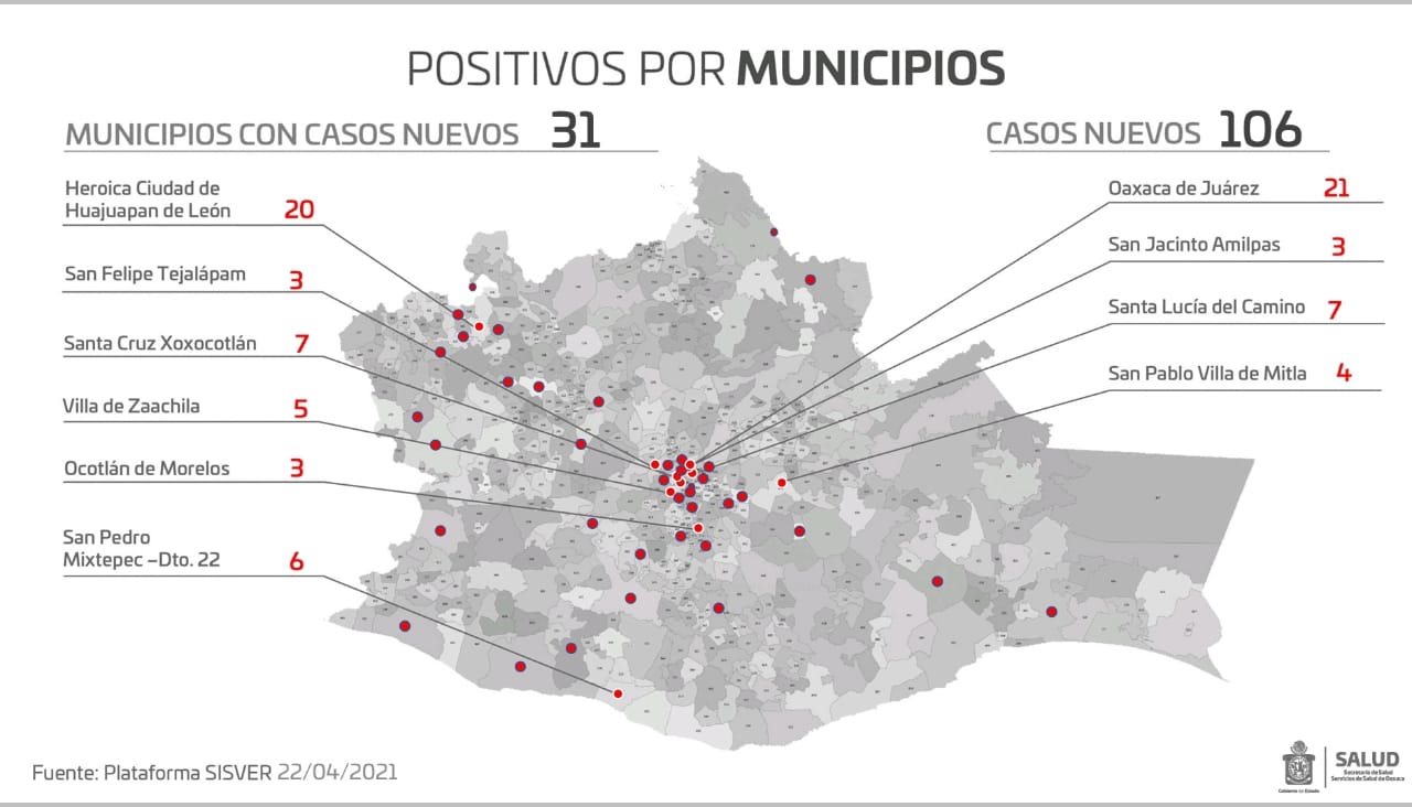 Indicó también, que este jueves se contabilizaron 106 contagios nuevos, ubicados en 31 municipios del territorio oaxaqueño, siendo con la mayor incidencia Oaxaca de Juárez, zona que reportó 21 casos, seguido de Heroica Ciudad de Huajuapan de León con 20, Santa Cruz Xoxocotlán y Santa Lucía del Camino con siete cada uno, así como San Pedro Mixtepec Distrito 22 con seis y Villa de Zaachila con cinco, el resto cuatro, tres, dos y un caso.