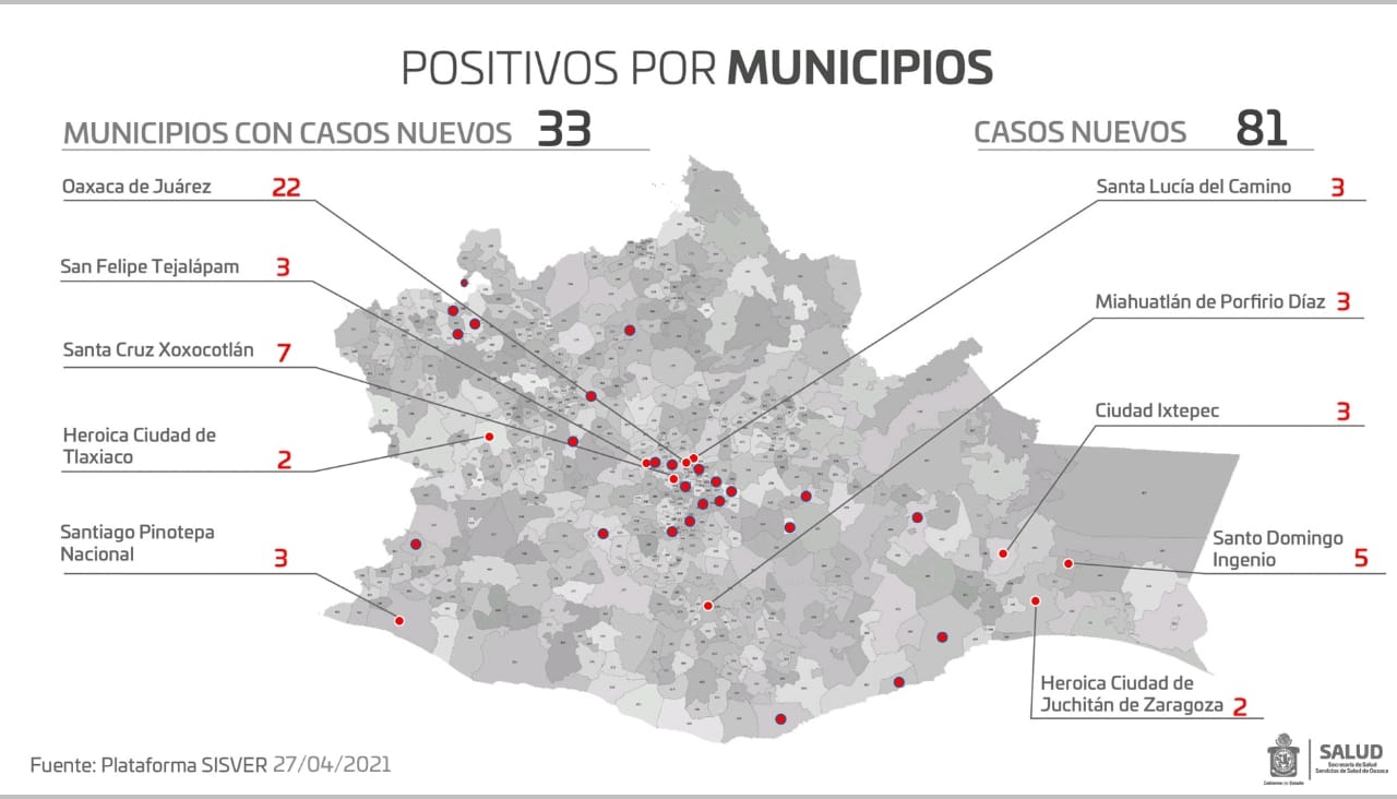Los 81 casos nuevos se distribuyen en 33 municipios, siendo el de Oaxaca de Juárez con 22; Santa Cruz Xoxocotlán con siete; Santo Domingo Ingenio con cinco; Ciudad Ixtepec, Miahuatlán de Porfirio Díaz, San Felipe Tejalapam, Santa Lucía del Camino y Pinotepa Nacional con tres cada uno; el resto dos y un caso.