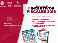 Aprovecha los incentivos fiscales del Ayuntamiento de Oaxaca de Juárez Lunes, Enero 6, 2020 - 20:00La ciudadanía podrá acceder a descuentos del 10 y hasta el 50 por ciento en el pago de impuestos municipales.Leer más