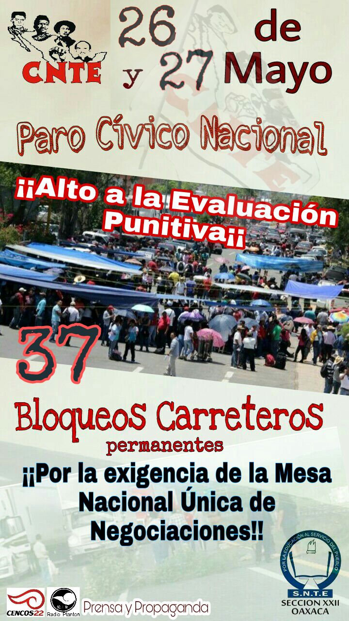 Oaxaca.- La sección 22 de la CNTE de Oaxaca ha anunciado para mañana viernes y el próximo sábado, la instalación de 37 bloqueos a lo largo y ancho del territorio estatal, esto en repudio a la evaluación docente.