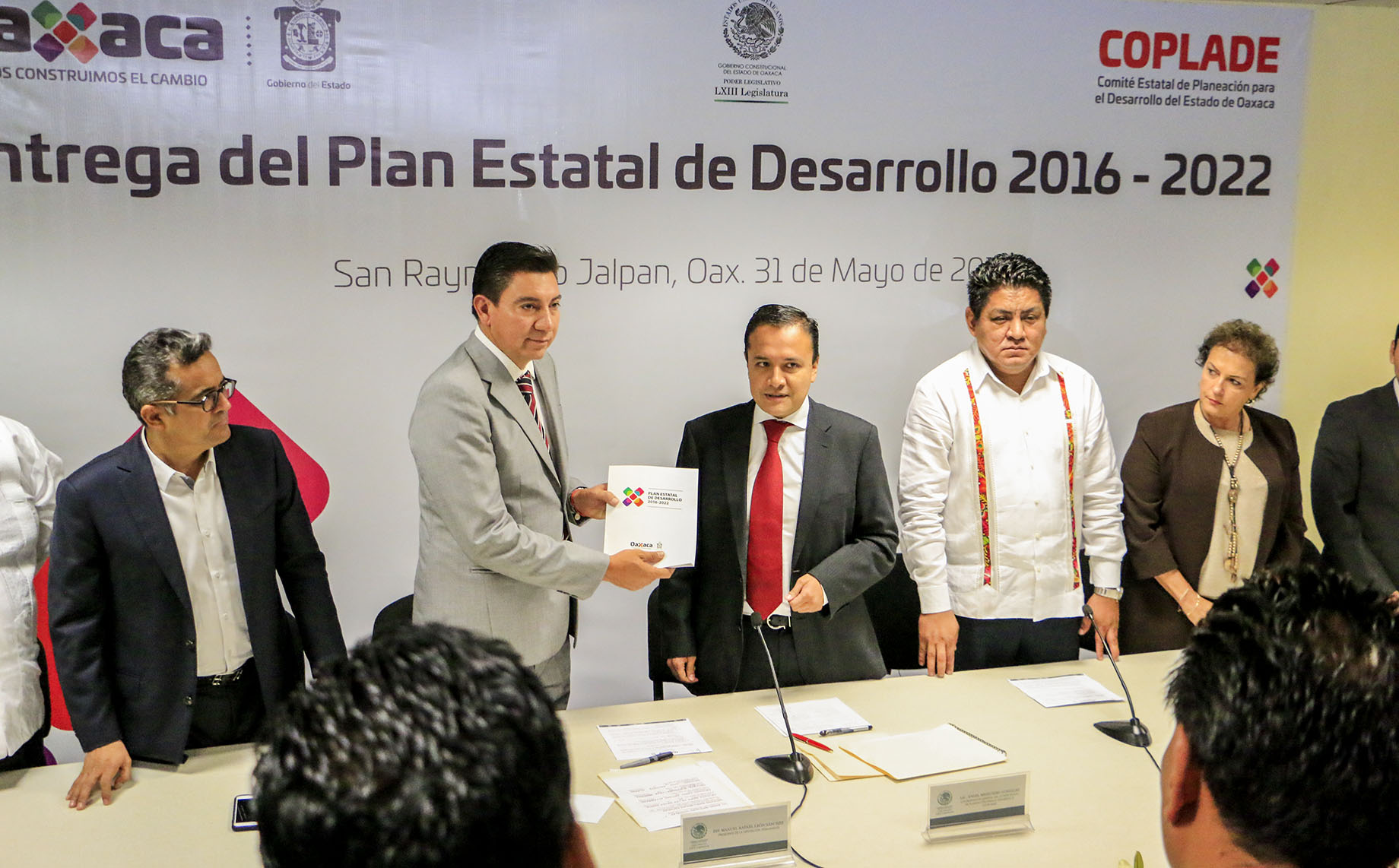 San Raymundo Jalpan., Oaxaca.- En la sede del Honorable Congreso del Estado de la LXIII Legislatura; este día los legisladores locales recibieron el Plan Estatal de Desarrollo 2016-2022, el cual será turnado para su revisión y análisis a la Comisión Permanente de Presupuesto, para posteriormente ser aprobado en el pleno de la Cámara. En tiempo y forma el documento fue entregado por Ángel Meixueiro González, titular del Comité Estatal de Planeación para el Desarrollo de Oaxaca (COPLADE) a nombre del Gobernador del Estado Alejandro Murat Hinojosa.