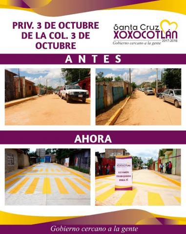 Santa Cruz Xoxocotlán, Oaxaca..- En materia de urbanización, Santa Cruz Xoxocotlán sigue avanzando con acciones firmes que atienden directamente las necesidades de la población”, señaló el edil Alejandro López durante la inauguración de la obra de pavimentación de la Privada 3 de Octubre, en la colonia del mismo nombre.