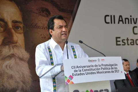 Oaxaca de Juárez, Oax.- La Constitución y la ley no se negocian, se cumple; y volver al respeto irrestricto de la ley es el único camino para salir del atolladero de la desigualdad, la inseguridad y la violencia, sostuvo el Presidente Municipal de Oaxaca de Juárez, Oswaldo García Jarquín, al participar como orador oficial de la ceremonia del CII Aniversario de la Promulgación de la Constitución Política de los Estados Unidos Mexicanos.