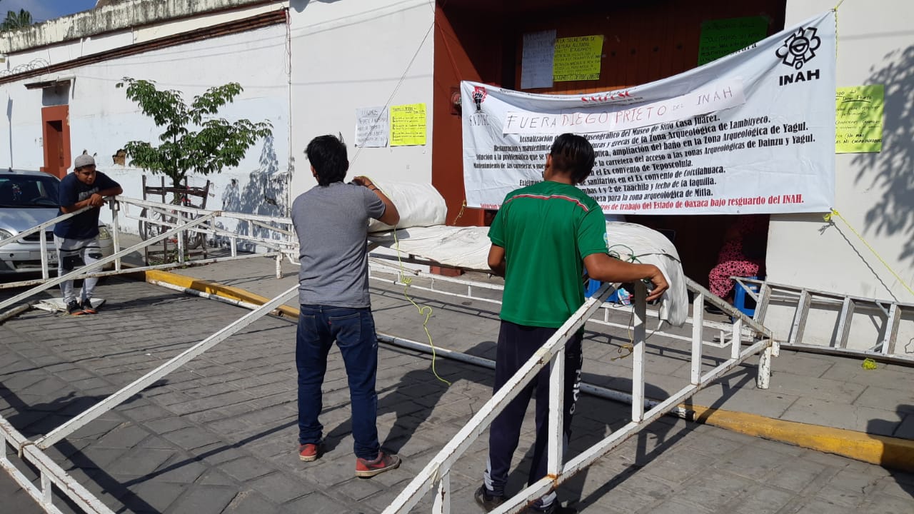 Oaxaca. Oax.- Integrantes del Sindicato Nacional Democrático de Trabajadores de la Secretaría de Cultura, protestan en las oficinas administrativas del INAH, y amagan con cerrarán a partir del 22 de julio.