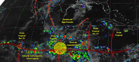 México. Un canal de baja presión, interaccionará con aire inestable superior sobre el oriente, centro y occidente de México, y generarán lluvias puntuales muy fuertes acompañadas de descargas eléctricas y granizadas sobre las regiones mencionadas. La onda tropical No. 36 recorrerá el sur del territorio nacional, asociada con una zona de inestabilidad con potencial ciclónico al sur de las costas de Guerrero, originarán lluvias puntuales intensas en el sur del país. La nueva onda tropical No. 37 interaccionará con un canal de baja presión ubicado sobre la Península de Yucatán, y ocasionarán lluvias fuertes con actividad eléctrica.