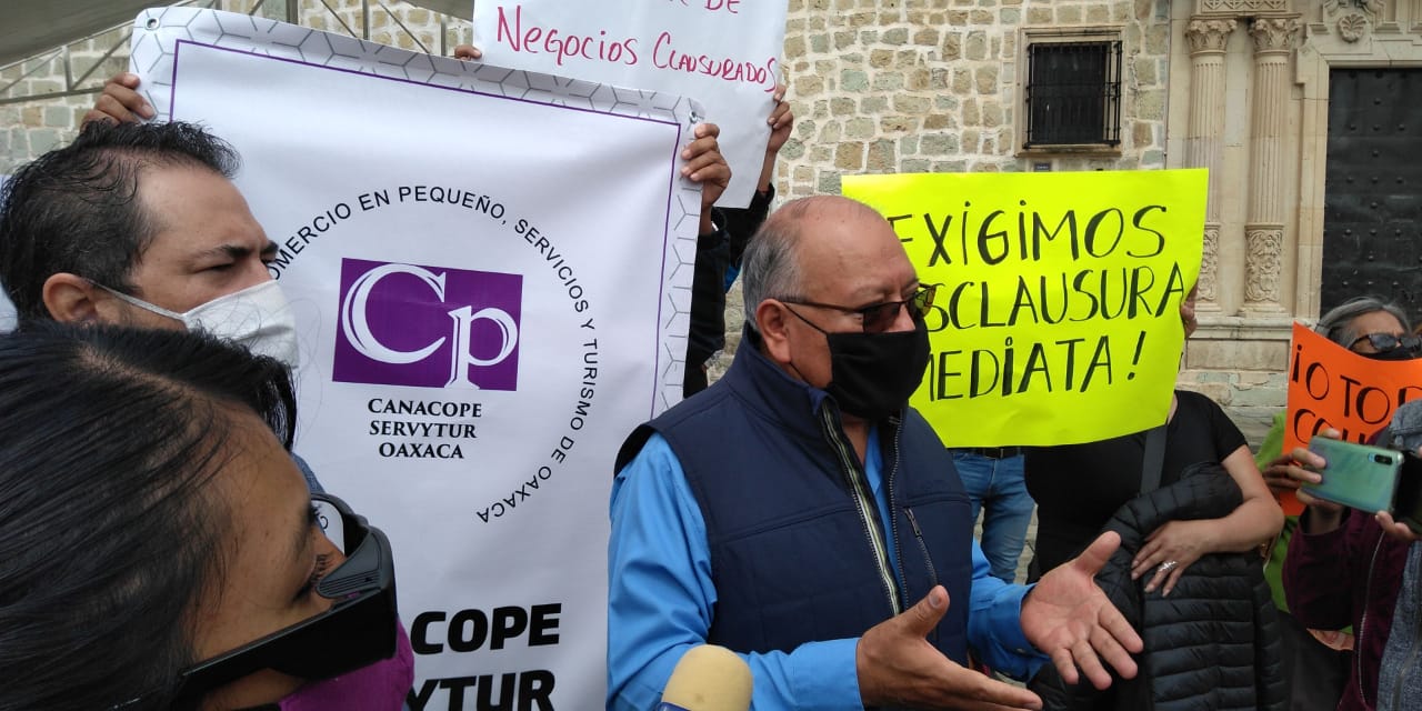 Oaxaca. Un grupo de comerciantes y empresarios adheridos a la CANACOPE SERVITUR se manifiestan en el palacio municipal, esto en exigencia de ser atendidos por el presidente municipal Oswaldo García Jarquín.