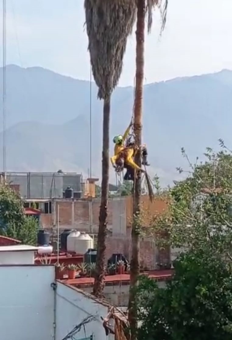 Gustavo Calderón Mateos, se encontraba en las alturas realizando la poda, cuando por un descuido la copa de la palmera colapsó, quedando de cabeza por el arnés de seguridad y apretado con el tronco de esta especie de cocotero.